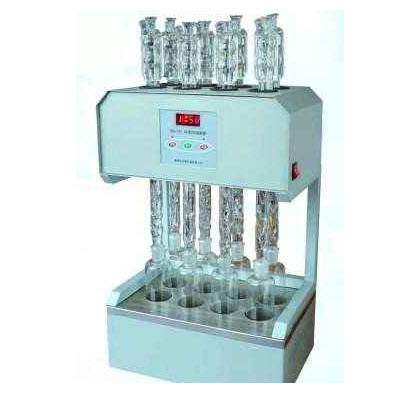 消解器采用微机技术进行定时控制加热电炉,可对8,12个24号标准磨口的柱形瓶回流装置同时进行加热。达到节能、减低电力负荷、提高效率的目的。采用玻璃毛刺回流管代替球形回流管,并以风冷技术取代自来水冷却方式,既可以节水又能使仪器规范化,同时还提高了仪器使用的安全性。