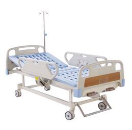 该床外型美观、坚固耐用,可承重250KG以上,摇手柄转动灵活并有两极空转限位装置。铝合金压铸脚罩,高强度、高耐磨的中控静音脚轮,使床移动灵活、轻巧、方便。配二个PP护栏(可上下定位)、输液架、引流挂钩。