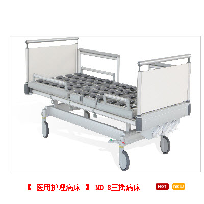 (3)床面分成四段,有手摇柄控制体位变化,四周为铝合金框架,全封闭,易清洁,耐化学品腐蚀。其背板、臀板、大腿板、小腿板的黄金比例分布背板长达90cm,整体床垫补偿装置和床头板斜面使背板定位更符合人体工程学原理,从而避免患者由病床滑落,同时可减轻患者腹部的压力,从而使呼吸更顺畅。