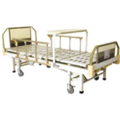 台式床头床尾、塑钢床框、冲孔床面、折叠式四档铝合金护栏、5寸静音脚轮、翻板式餐桌;