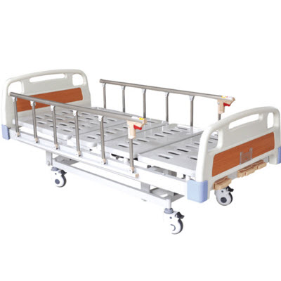 三摇病床--型号:NFB-002 : 病床规格为:2050×960×450—680(mm);背部折起角度为:0~80°;腿部折起角度为0~45°;高度调节450~680mm;病床采用ABS床头尾板、优质冷轧钢板一次冲压成型床面,配6档防夹手高档折叠式铝合金护栏,5寸带刹车防缠绕包罩静音脚轮;增强型ABS抽拉式摇把,带双向极限保护丝杆;病床整体采用环保型静电粉末喷涂,配高度可调不锈钢输液杆。