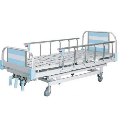 铝合金床头三摇医用病床-型号:NFB-008;本款医用病床采用优质铝合金扁圆管成型床头尾板,优质冷轧钢板一次冲压成型床面,配6档防夹手高档折叠式铝合金护栏,5寸带刹车医用静音脚轮;增强型ABS折叠式摇把,带双向极限保护丝杆,床框两侧配有引流挂钩;病床整体采用环保型静电粉末喷涂,配高度可调不锈钢输液杆。