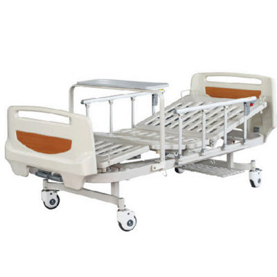 本款医用病床采用可快速拆卸巴拿马式ABS床头尾板、优质冷轧钢板一次冲压成型床面,4档防夹手铝合金折叠式护栏,5寸带刹车防缠绕包罩静音脚轮;增强型ABS抽拉式摇把,带双向极限保护丝杆;配ABS隐藏式翻板餐桌;床框两侧配有引流挂钩;床下配杂物架一个,病床整体采用环保型静电粉末喷涂,配高度可调不锈钢输液杆。