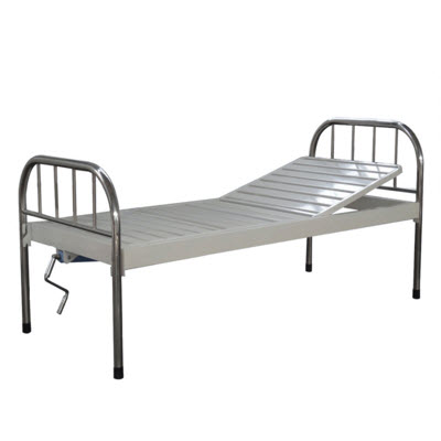 优质加厚不锈钢圆管液压弯曲成型制作床头、床尾,钢制板条床面,镀铬可折叠摇把,单摇把设计,可调节背部角度,双向极限保护丝杆。可根据客户要求配置护栏、脚轮、餐桌等附件。
