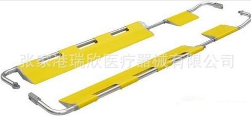采用分离型刚性结构,转送骨折及重伤病员。两端设有离合装置,使担架分离成左右两部分。在不移动病人的情况下,迅速将病人铲入或从病人体下抽出担架。担架长度根据人身长可作随意调节。担架一端(脚部)采用窄框架结构。