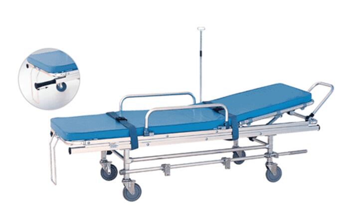 折腿机构由两侧把手控制,担架配有保险锁,上救护车时打开,担架站立时锁住。