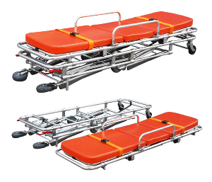 采用高质铝合金材料,配接件铝合金压铸。采用海绵软垫,使伤病员躺卧舒适。折腿机械结构,通过左右手柄控制。仅需一名救护人员把病人推上救护车。固定支架与救护车相固定,担架通过滑道上车后可锁定。担架可分离,可以快速抢救病人。