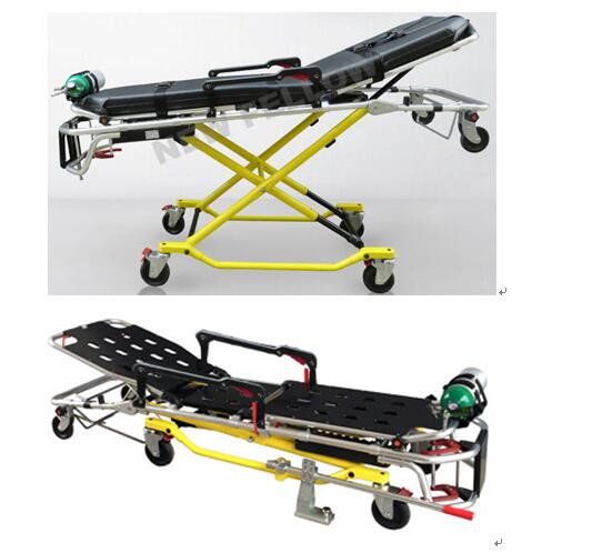 材质:高强度铝合金材质,结实耐磨耐用,承重度高,耐腐蚀。X结构起落抬起便捷,方便上下救护车。把手处弧状设计,推行时更省力便捷,不伤手。靠背角度由气弹簧调节,使伤员感觉舒适,范围0-65°,担架头部可折叠,方便推动使用。可调节护栏在转移过程中保护病人,推行时省力便捷。