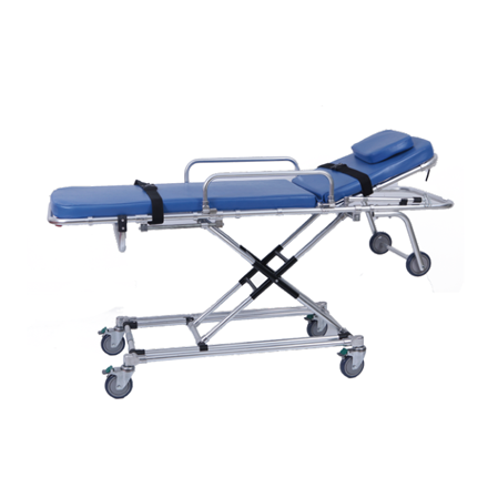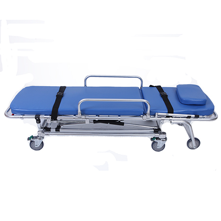 ·担架高度可随意调节,调节高度时按动手柄。·需二名救护人员把担架推上救护车。·采用防渗水海绵软垫,背靠角度和腿部可调节,使伤病员躺卧舒适。·本担架配有保险锁,运送病人时必须锁止。