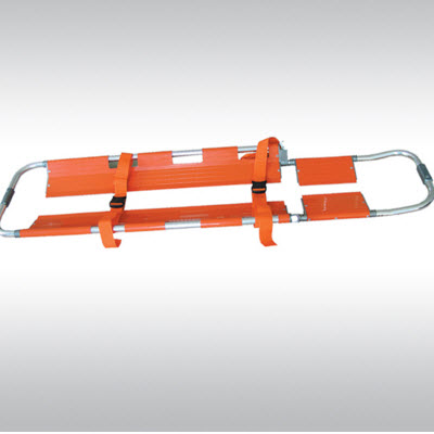 铲式担架采用分离型刚性结构,两端设有离合装置,使担架分离成左右两部分。在不移动病人的情况下,迅速将病人铲入或从病人体下抽出担架。担架长度根据人身长可作随意调节。担架一端(脚部)采用窄框架结构。
