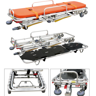 采用高质铝合金材料,用海绵软垫,使伤病员躺卧舒适,折腿机械结构,通过左右手柄控制。仅需一名救护人员把病人推上救护车。固定支架与救护车相固定,担架通过滑道上车后可锁定。担架可分离,可以快速抢救病人。