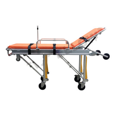 折腿机构由两侧把手控制,担架配有保险锁,上救护车时打开,担架站立时锁住