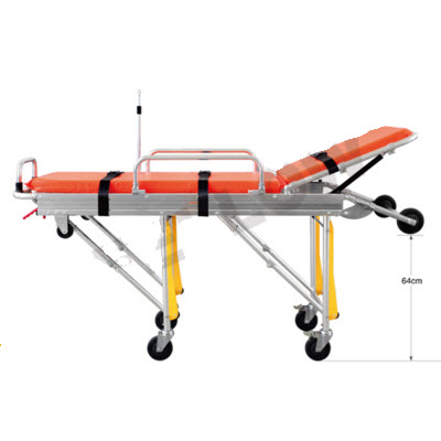 折腿机构由两侧把手控制,担架配有保险锁,上救护车时打开,担架站立时锁住