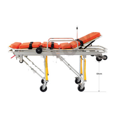 折腿机构由两侧把手控制,担架配有保险锁,上救护车时打开,担架站立时锁住