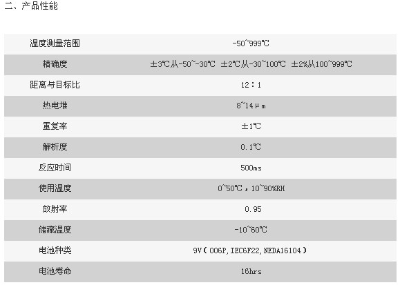 TM-660测量范围:-50~999℃,物距比:12:1,在您无操作后6秒自动关机,方便省电。两种温度制式转换,背光显示,镭射制式,这一切都为您的温度测量工作带来完美的享受。