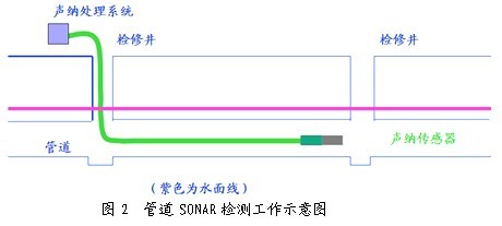 声纳利用自身装置向水中发射声波,通过接收水下物体的反射回波发现目标,目标的距离可通过发射脉冲和回波到达的时间差进行测算;声纳检测系统在计算机及专用软件系统的支持下对接收的反射声波信号进行自动处理,以测定检测目标的各种参量,达到进行管道运行状况检测的目的。声纳系统可辨认并定位管道内部的沉积物、凝结物,同时对变形、破裂等缺陷进行判断,适用于不宜进行CCTV检测的、水充满度较高的污水管道。