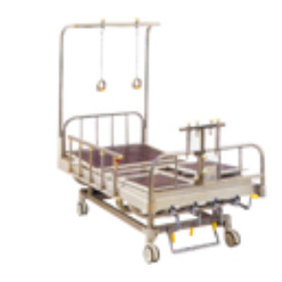 不锈钢床头床尾、牵引架、塑钢床框、PPC床面、可X光透视、折叠式五档铝合金护栏、6寸中控制动脚轮;