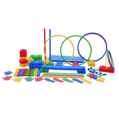 收拾袋尺寸(cm):73.5(L)*83(w)*17(H) 内容组件:半砖12块,全砖8块,平衡桥4片,35CM体能环4个,57CM体能环4个,35cm体能棒16支,70cm体能棒8支,棒夹12个,环夹12个,豆袋10个,彩色手脚印各6对,使用指导手册1本。