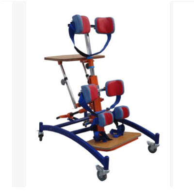 直立式或前倾式站立架,倾斜角度:0-40度,桌面高度可调,整体可拆装折叠,带脚轮,可移动。护胸,护腹,护腿,设计合理。适用10岁以下站立功能障碍儿童进行站立训练。