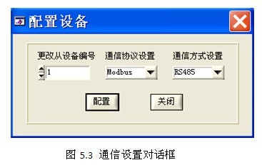 此软件可以对设备的一些参数进行写入设置。可以配置的内容包括仪器的modbus从设备编号,通信协议设置和通信方式设置。配置设备由软件工具栏的“设置->配置设备”进入。配置设备的界面如图5.3所示。