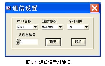 软件启动后,需要首先进行软件通信设置。确定串口名称,通信协议,采样时间。如果使用的是Modbus协议,还需设置所通信仪器的设备编号。通信设置由软件工具栏中的“设置->通信设置”进入。通信设置界面如图5.4所示。