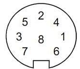 风速风向仪底部有一个8脚防水插头,用以通过屏蔽电缆线连接外部电源和通信接口。管脚功能分布如下: