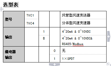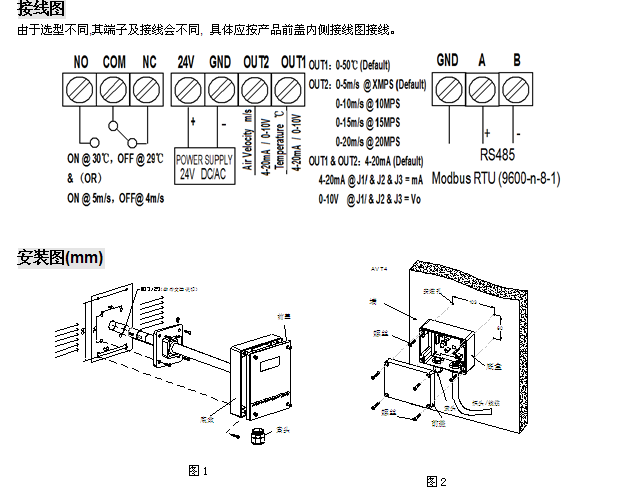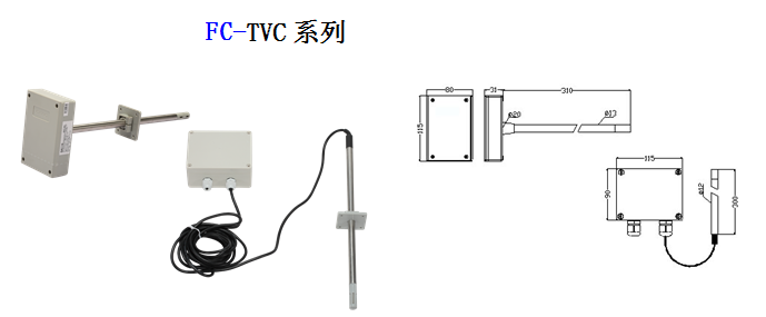输出:4~20mA,0~10VDC,RS485/Modbus 温度传感器:高精度数字传感器 量程:0~50℃ 精度:<±0.5℃@25℃ 响应时间:典型10s 输出:4~20mA,0~10VDC,RS485/Modbus 继电器输出:1×SPDT,1A/30VDC,0.5A/125VAC 模拟输出负载:≤600Ω(4~20mA),≥2KΩ(0~10VDC) 电源:18~30VAC/DC 工作环境:-20~85℃,0~95%RH(非冷凝) 外壳材料:防火ABS 防护等级:IP65,NEMA4 四、安装说明 ● TVC1要使用法兰附件安装,探头管插入深度可以调节,用四个螺丝固定安装法兰在管道上,法兰上的螺丝可以锁紧插入探头以及整个TVC。使用法兰安装在管道开孔Φ13mm,不用法兰安装(不建议)在管道开孔Φ21mm(见图1)。管道开孔要*后做好密封。 ● TVC4挂墙安装时应垂直,并注意探头线缆朝下。可在墙壁或其它适合安装的平面上选择合适测量位置,应远离影响测量的因素,如冷、热源等,并应避免阳光直射或雨淋,必要时应另行安装遮阳板或防雨棚。在安装平面处按照底盒的安装孔尺寸(见图2)打四个固定孔,打开前盖,再用四颗螺丝固定底盒。 ● 风速变送器应安装在气流稳定的位置,例如较长直管段的中间位置,探头前后直管段要有足够长度(建议前10D和后5D)以保证检测精度和稳定,且探头应尽可能靠近风管截面中心。(见图3) ● 风速变送器在标准风洞中单向平行标定,现场安装时也应保证气流方向与探头孔平行并与箭头方向一致。如图示,在探头顶部有气流方向箭头,在探头管上有辅助定位线,在安装附件法兰上有气流方向标识,在TVC1盒盖上也有气流方向标识,这些方向标识都可以帮助安装者确保气流方向与探头孔平行并与箭头方向一致。如不能平行安装,则角度越大,带来的测量偏差越大。如与箭头方向相反,测量也不会准确。(见图4,5,6) ● 打开前盖,在底盒下面孔安装配件索头。通过索头将DDC/PLC及电源等引线接入底盒,根据接线图(前盖内侧)完成接线。索头与底盒应保证密封良好。 ● 将前盖安装回原样,同样要注意保证密封(有密封圈),以使整体防护等级达到IP65。 注意事项 安装及接线过程中应断电操作。当使用24VAC电源时,建议使用独立的变压器。当与其它控制器、变送器或阀门驱动器等设备共用一个24VAC变压器时,应确保极性(24V和GND)连接完全正确,否则会带来不可预知情况,甚至损坏这些设备。 品质保证 在12个月的质保期内,基于正常使用和非人为损坏,对产品(仅本身)提供免费工厂维修服务。