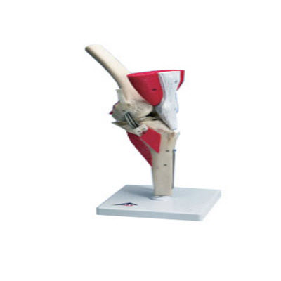 远侧股骨关节活动,与膝盖、胫骨和腓骨相连。展示了所有重要的膝关节肌肉。十字韧带和侧韧带三重弹性。内半月板带典型的 “提篮把手”裂伤。带膝盖骨腱。置于基架上。