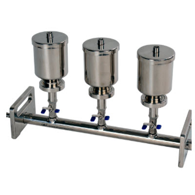 全不锈钢多联过滤器:全不锈钢材料,可进行热压灭菌高达180℃,可过滤一些常规方法不能过滤的酸碱性物质。