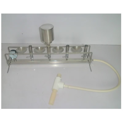 2.将滤器接杆上的橡胶塞,插入不锈钢底座,滤器的多小孔平面上装上浸泡的滤膜,放上不锈钢滤器倒入水样至相应刻线,便可进行抽滤。