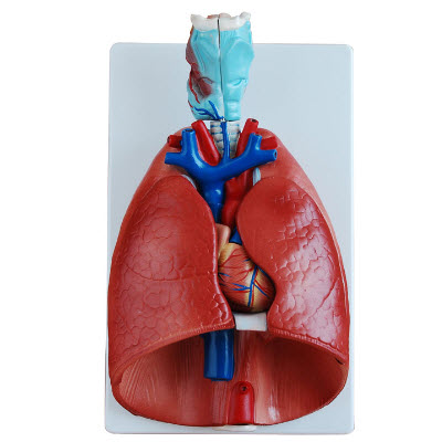 喉、心、肺模型自然大小,分成7件。两瓣肺叶可取下示其内部结构。心脏纵剖示心房、心室和瓣膜。喉头也分成两件。