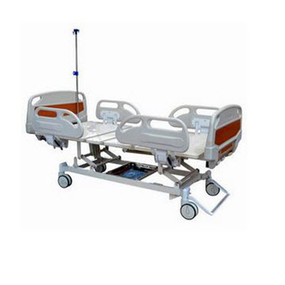 ●三摇三折,床面可升降;配有四个PP提升式护栏(可上下定位)、不锈钢二节输液架、杂物架、有机
