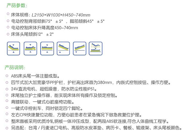 豪华五功能电动床 KX-838a在寰熙网如展示标价的,具体的成交价格可能因商品参加活动等情况发生变化,也可能随着购买数量不同或所选规格不同而发生变化,如用户与寰熙线下达成协议,以线下协议的结算价格为准。如用户在寰熙网上完成线上购买,则最终以订单结算页价格为准。多功能电动病床商品详情页中(含主图)以文字或者图片形式标注的价格、参数、描述均以线下寰熙销售人员提供的产品技术参数为准。
