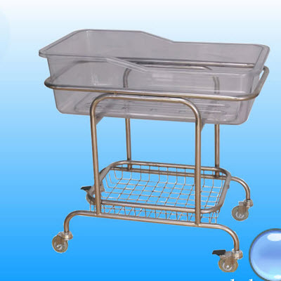 说明:不锈钢车架,婴儿盆材质为亚克力,清澈透明,干净整洁;整体婴儿盆架头部高于脚部,角度可按需要进行调节;承载重量达60kg,婴儿盆承重达20kg;双提升护栏;婴儿盆下的置物盆可放置各种医疗护理用品及各种婴儿用品。