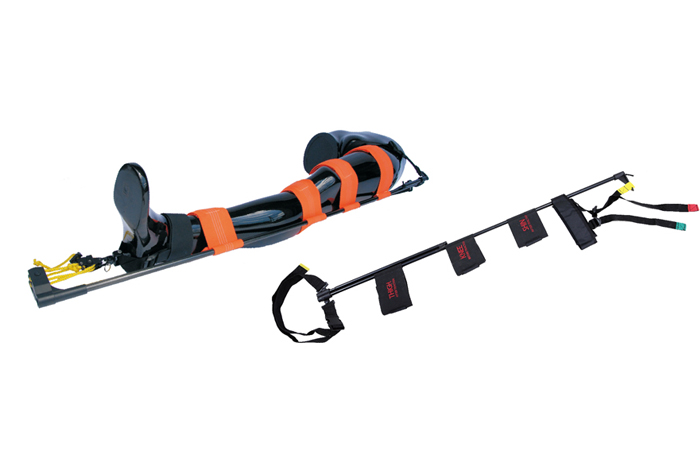 由铝合金制成,长度可调节,有尼龙绑腿带子的自动牵引装置。