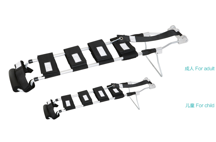 由铝合金制成,长度可调节,有尼龙绑腿带子的自动牵引装置。