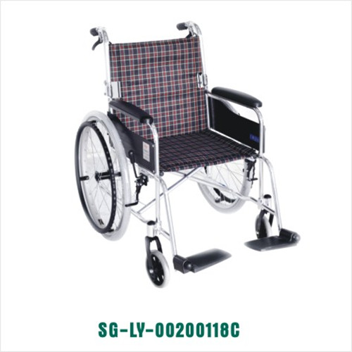 固手固脚,连杆式交叉杆,可折背,18寸格子布座背垫,铝前叉,6寸塑料前轮,22寸铝圈,塑料手轮,充气后轮,带手刹,塑料踏板。