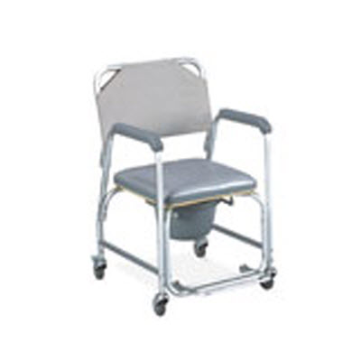 铝合金沐浴便椅,坐便、洗浴、推行三用椅,铝合金车架氧化处理,带坐便,深圆便桶,带海绵座垫,带靠背,可拆卸,带不锈钢脚轮
