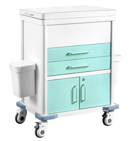 2、两层抽屉,一个柜体,两侧各带一个污物桶,静音脚轮,其中两只带刹。