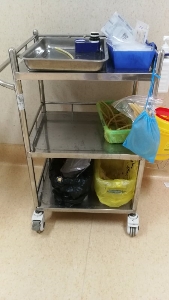 治疗车带上不锈钢治疗盘、药杯、配药盒