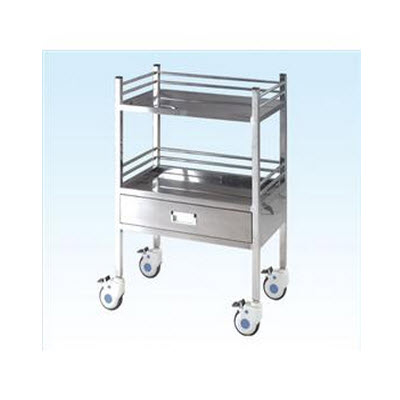 ?器械车分为上下两层,均带有不锈钢护栏,器械可分类放置在不同层面上,下层带拉式抽屉,方便实用。