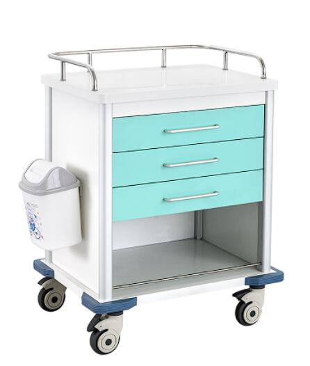 2、配三层抽屉,侧面配一个ABS污物桶,静音万向脚轮4只,带对角刹车。