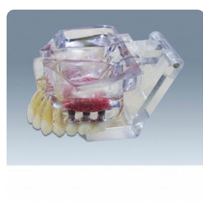 透明模型中可见正常牙根。种植体在颌骨内的情况,种植中使用上颌窦提升术,可见上颌窦提升后形态。用于口腔种植修复和固定修复的示教