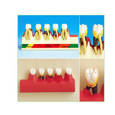 功能特点:该模型由正常下颌磨牙与牙周病牙等5个部件组成,显示正常下颌磨牙的形态和构造以及牙周病牙病发展过程等结构,共有15个部位指示标志。