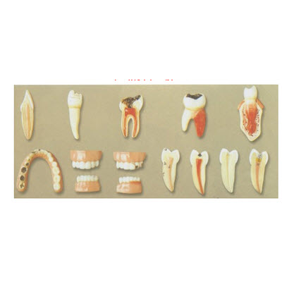 功能特点:该模型由健康牙齿与牙髓炎、牙周炎、龋齿等病牙以及作好充填准备的牙齿,已用银汞合金充填的牙齿等12个部件组成,并显示健康牙齿与牙髓炎、牙周炎、龋齿等病理形态以及临床治疗方法,共有12个部位指示标志。