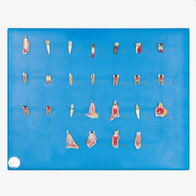 ■该模型由佝偻病、哈钦森病牙、全牙坏死、慢性牙周病、龋齿、化脓性牙髓炎、全牙坏疽、牙髓息肉、牙根脓肿、牙槽脓肿、牙龈瘘管等25种病牙部件组成,并显示上述牙科疾病的病理形态,共有25个部位指示标志。