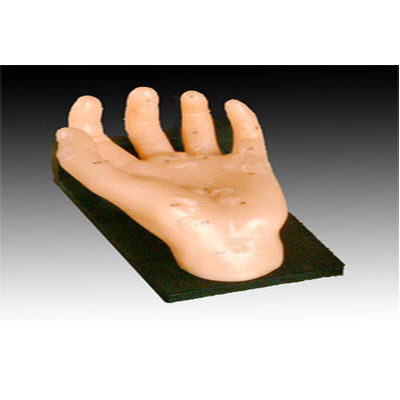 这是新近开发的保健手模型,用PVC制成,显示相对应的人体内脏器官在手上的针灸位置。安放于木底座上。