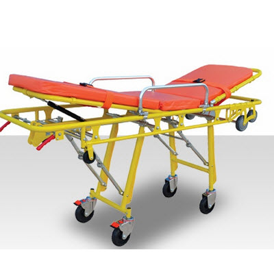 担架主体采用钢制结构。采用海绵软垫,使伤病员躺卧舒适。折腿机械结构,通过左右手柄控制。仅需一名救护人员把病人推上救护车。