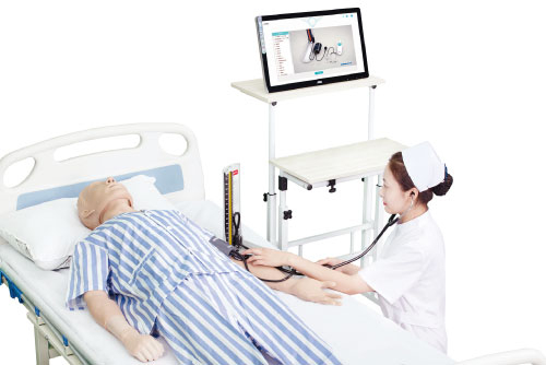本产品特点在于,能够通过综合模拟病人设置产生各种异常生命体征,实现结合临床病例进行生命体征测量评估的情境式教学系统。综合模拟病人具有完整的全身骨骼结构,系统软件分为教学、训练、考核三种模式,教学内容丰富,体温、脉搏呼吸、血压均可设置临床常见的各种异常生命体征,并具备评价考核功能。