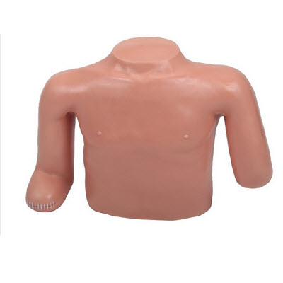 ■ 右臂肩关节、肘关节、腕关节可活动,肘关节可伸展,腕关节可旋转,既可摆成上肢骨折固定位,也可摆成上肢的功能位置,右手食指截指,可练习截指的包扎;左臂为肘上截肢,可进行残肢的包扎;
